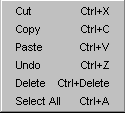 Any Entities that are currently selected are copied to the Paste Buffer. This menu entry will not be active unless there are entities currently selected. This action may be performed without having to access this menu through use of the keyboard shortcut key combination of Control and C.