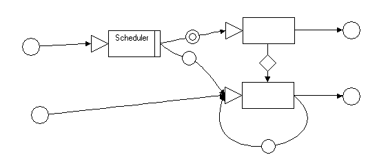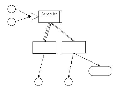 - The Scheduler is examined to check if it has a Merge Symbol joined to its left hand edge. If it hasn't one is added and any input data flows are moved from the Scheduler to the Merge.