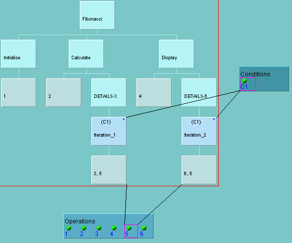 The Structure Editor graphically shows the operations and conditions available in a structure using floating "bars". These are like peg-boards with one labelled peg per operation or condition. There are three bars one each for Operations, Conditions, and Quit Conditions - they are colour coded in the same way as boxes. These can be used to assign operations or conditions to nodes in the structure simply by dragging them over a box. If a box is a valid drag and drop target it will be highlighted with a green rectangle. Valid targets for each item are as follows :-